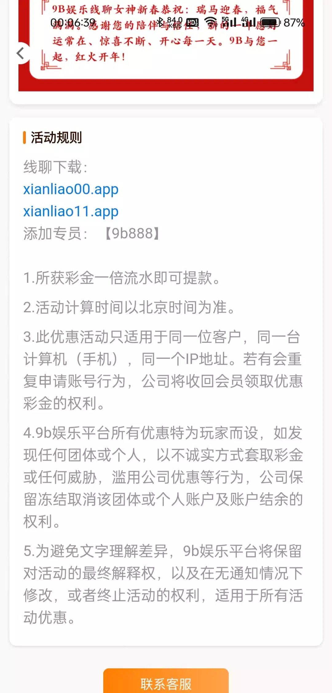9b娱乐23号找线聊客服领9元彩金,必须历史充值10+以上才能领,一倍流水领到的老哥或者打出来的老哥反馈下。