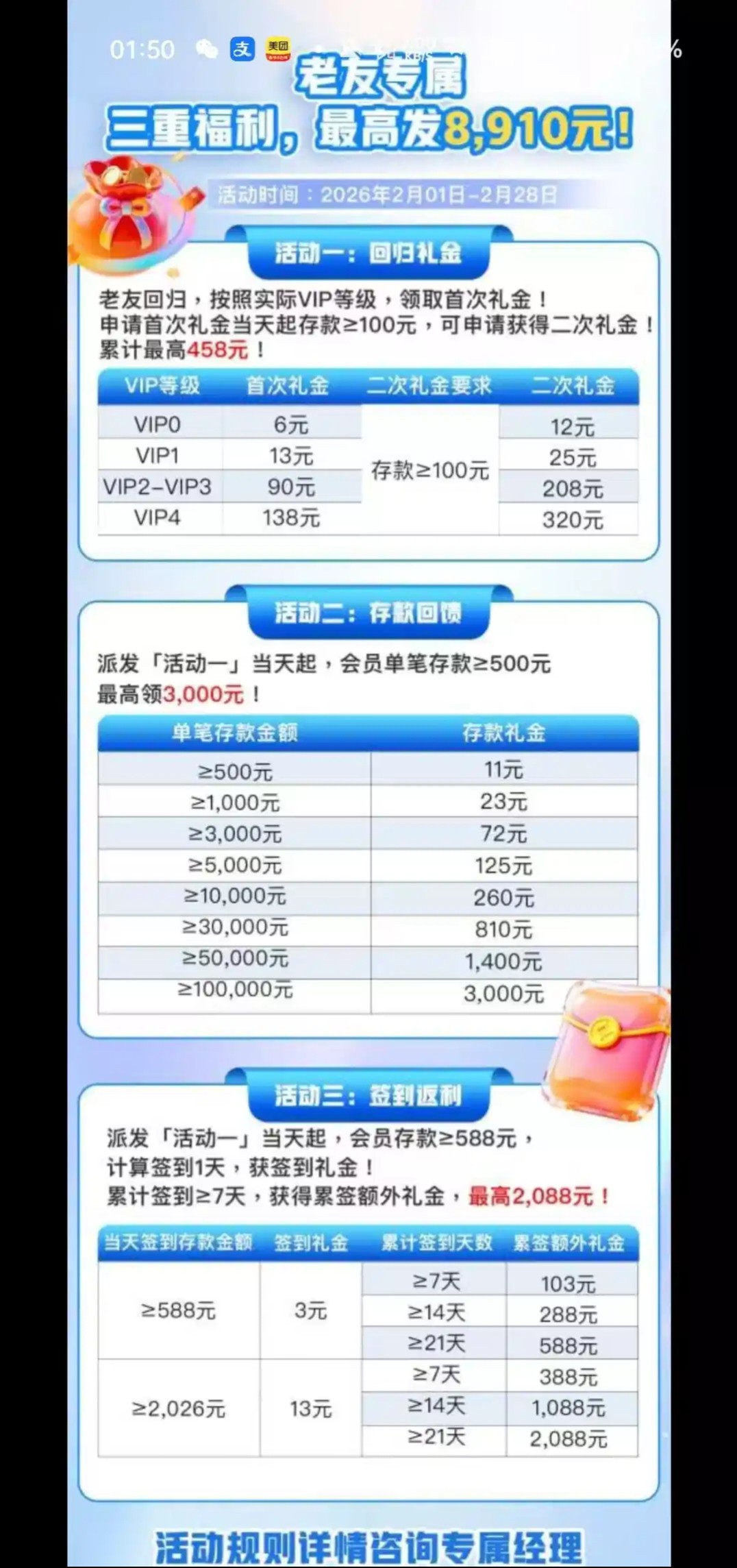只是给大家分享,小心反撸,可以就去参加一个回归彩金,好像是距离上次充值 15 天才可以领,具体的联系经理吧