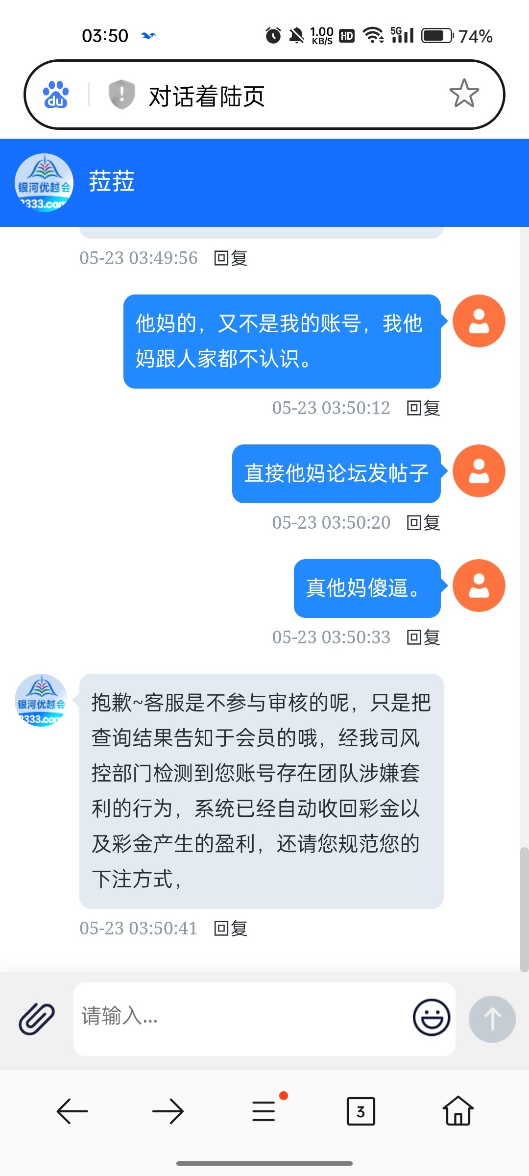 今天拉了两个下级。送出两个18。一个挂逼。一个拉麻将拉到100多。提现说团队涉嫌套利。这种傻逼他妈以后1毛钱都不会充。不纯纯二逼吗?