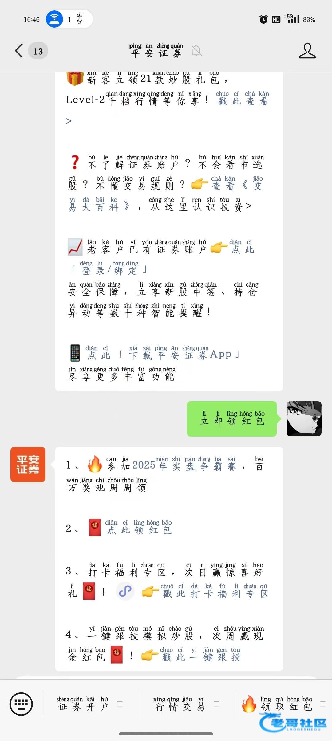 #小程序://平安证券/FMU3XLHLosL73pr复制到微信打开关注公众号,发送 立即领取红包,点击领取红包    手机号验证码登入   然后就可以抽取红包,不用开户的,红包也是必中。