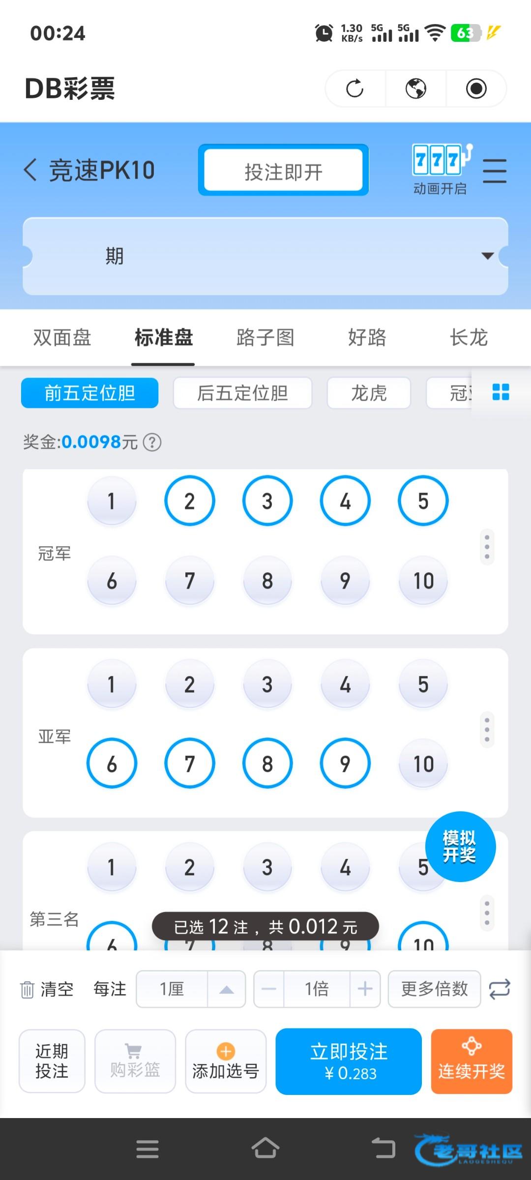 6月13开始,一元投注大转盘抽彩金。网址就是博系名字就能打开。账户有5毛钱即可刷够流水,选择 平台彩票, 即开彩极速赛车。单注选择1厘 冠军2345亚军6789季军67910 连续开奖80次即可够流水。余额仅需要0.5元亲测。投注详情如图。
