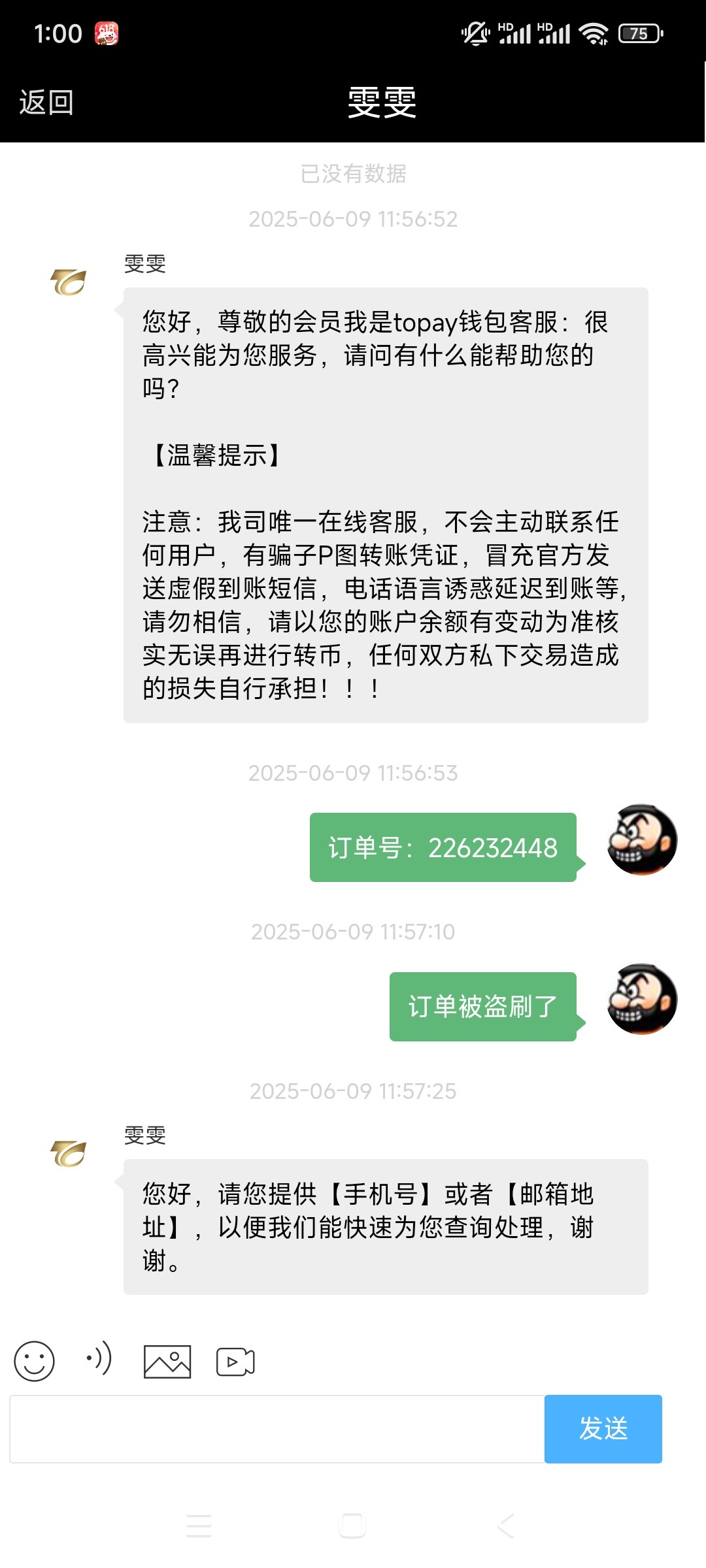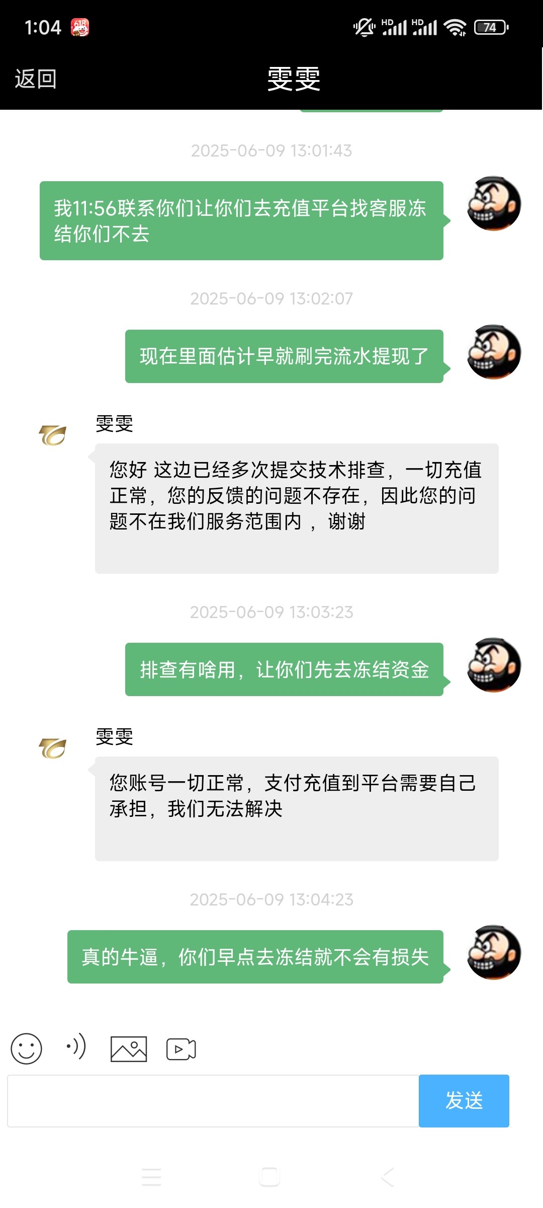 今天11:48盗刷,我11:56发现了,找客服让他去冻结充值的平台。本来可以挽回的,客服就是不去,顺就是我自己充值的。一直拖。我估计就是平台内部人员搞的。老哥们不要留币,我是没有卖出去,卖了一万多。