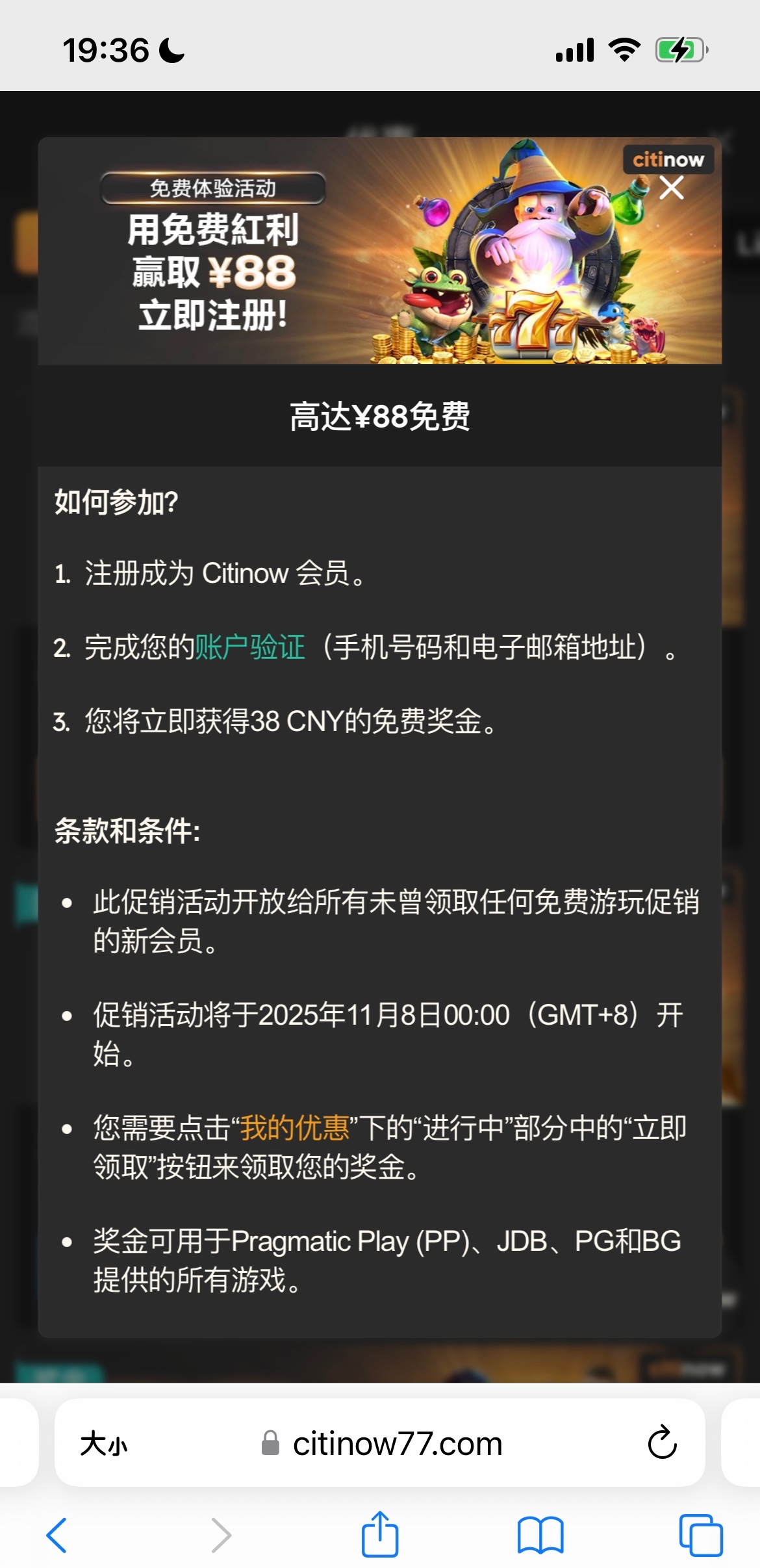 注册账号了手机号接收不到验证码的话找在线客服申请手动验证,客服会让你加客服微信验证就可以了,验证完在个人中心我的优惠里领取,要打190流水才能转出中心钱包,我就撸了一个号没打出来,老哥们加油,好像还没看到有人发过这个,祝各位大红,